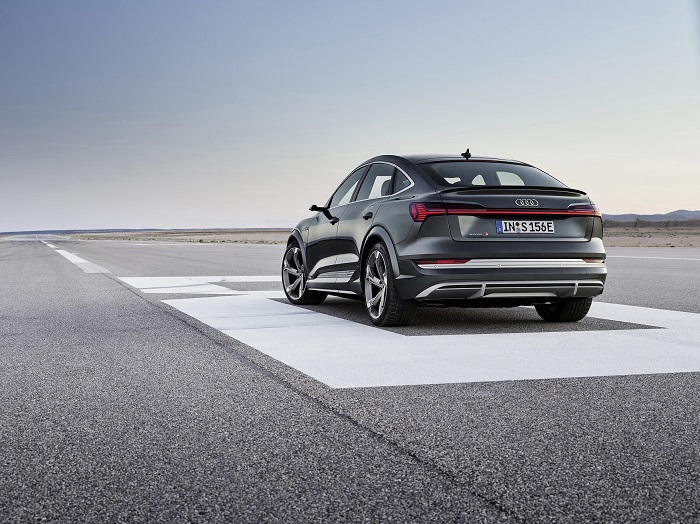 O Audi e-tron S Sportback possui para-choques dianteiro e traseiro com contornos fortes e entradas de ar particularmente grandes e expressivas. A inserção do difusor na extremidade traseira se estende quase por toda a largura do veículo. O fato de os arcos das rodas em ambos os lados serem 23 milímetros mais largos faz com que os carros pareçam muito potentes. Os acabamentos cromados na parte dianteira e traseira se tornam destaques.