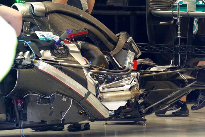 Do ponto de vista lateral podemos apreciar a instalação esmerada, ao contrário do que é visto em ambas as unidades de potência da Ferrari e da Renault. A unidade de potência Mercedes não só é mais forte e eficiente, mas também é 18 kg mais leve e todas estas características se traduzem em uma grande lacuna em relação à concorrência – uma lacuna que de acordo com engenheiros da Lotus, que a partir da próxima temporada vai usar o motor Mercedes, foi quantificada em 1,4 segundos. Ouvindo estes números não é difícil entender por que no domingo na pista russa tivemos cinco carros movidos pela Mercedes nas primeiras posições.