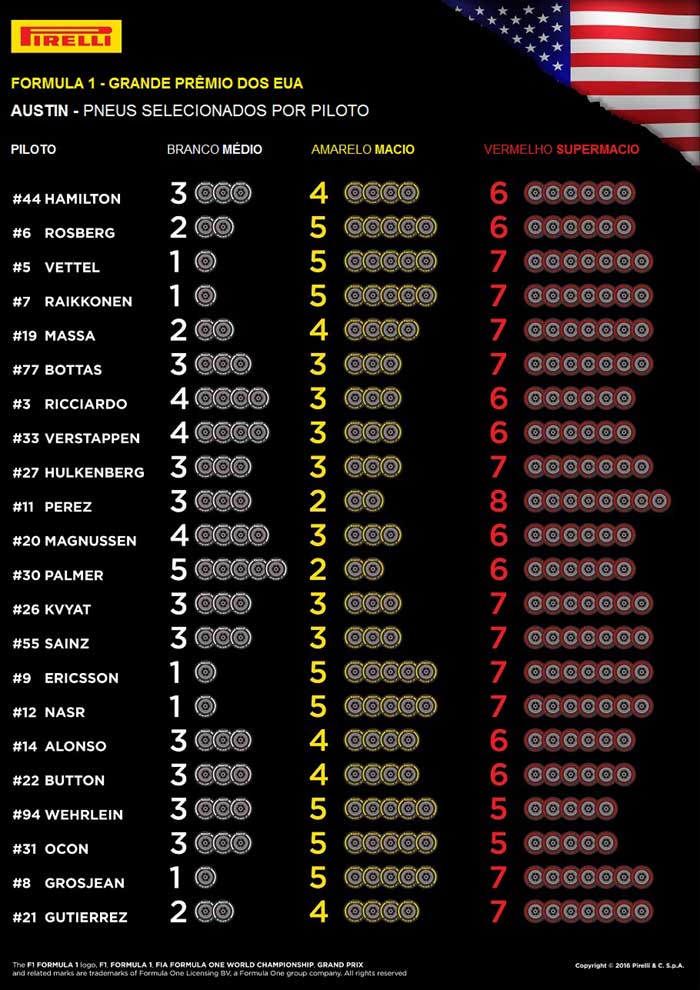 Max Verstappen e Daniel Ricciardo, da Red Bull, escolheram quatro do médio, três do macio e seis do supermacio, enquanto Sebastian Vettel e Kimi Raikkonen, da Ferrari, optaram por apenas um jogo do médio, cinco do macio e sete do supermacio.