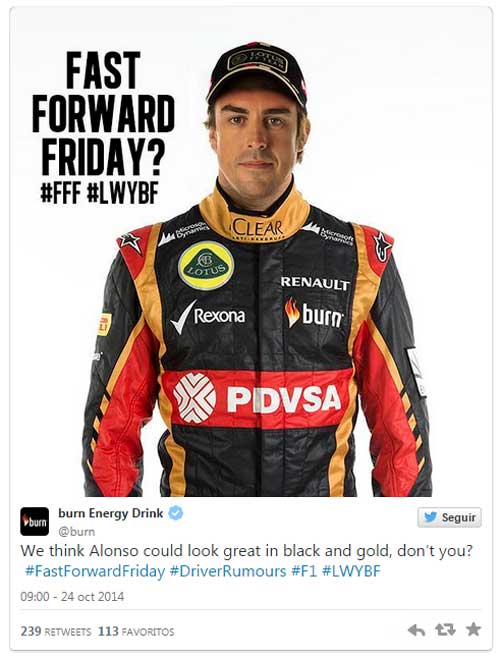 Nesta conjuntura, a bebida energética ‘Burn’ lançou uma pergunta em seu perfil oficial no Twitter: “Achamos que Alonso fica bem de preto e dourado, você não acha?” E junto a essa questão uma imagem, ou melhor, uma montagem, o espanhol vestindo o macacão da equipe Lotus.