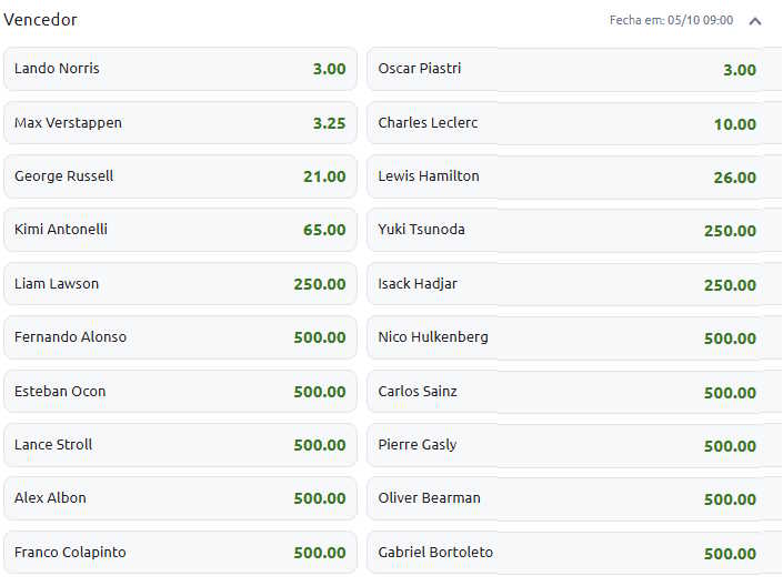 Trata-se de uma pista de rua que pede carros com alto downforce e ótima tração nas saídas de curva. Entre os itens mais importantes de um carro de F1, tração, aceleração rápida nas pequenas retas e bom contorno de curvas lentas são os itens mais importantes. A McLaren tem um ligeiro favoritismo nas casas de apostas com Norris – que dominou fácil no ano passado – e depois Piastri. Mas Verstappen vem logo atrás e não deve ser descartado depois da melhora da Red Bull nos dois últimos GPs.