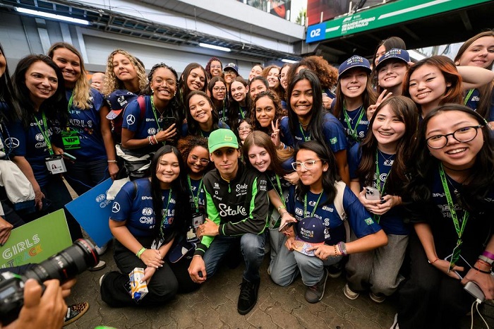 Bortoleto na foto – Depois das palestras, as estudantes caminharam pela pit lane, visitaram os boxes do safety car e do medical car da F1, da Mercedes e da Visa Cash App Racing Bulls, equipe dos pilotos Isac Hadjar e Liam Lawson, estiveram na linha de chegada na pista e no pódio. Mas os episódios mais emocionantes foram vividos no paddock. Nesse quesito, nada superou o momento em que elas se encontraram com o piloto brasileiro Gabriel Bortoleto, atraindo um paredão de fotógrafos quando ele se posicionou entre elas para uma foto.