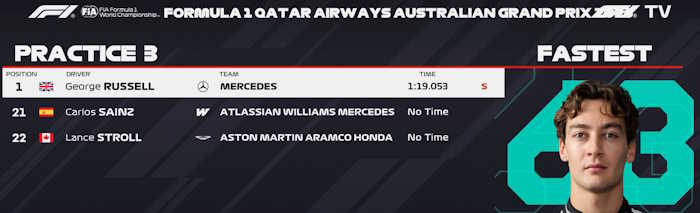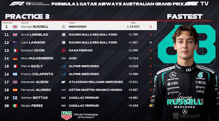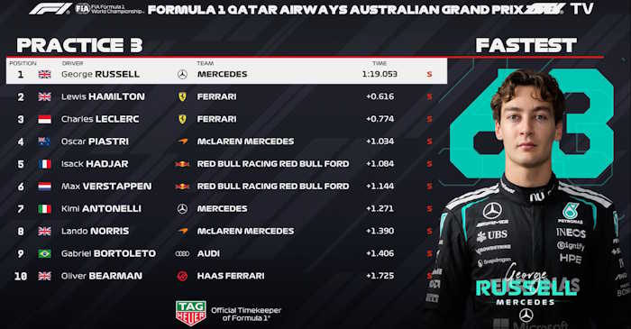 Russell foi o mais rápido durante o terceiro e último treino livre do GP da Austrália. Portanto, ele superou Lewis Hamilton por uma enorme vantagem de seis décimos e meio em Melbourne. Charles Leclerc completou o pódio antes da classificação, enquanto Oscar Piastri e Isack Hadjar vieram logo atrás.
