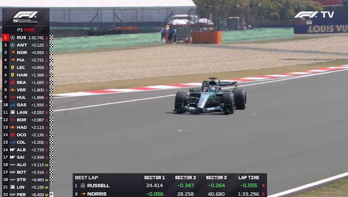 A Mercedes continuou de onde parou em Albert Park. Antonelli foi o mais rápido inicialmente com 1:35 cravado, antes de Russell superá-lo por apenas 29 milésimos de segundo. Ambos os pilotos utilizavam pneus médios naquele momento. Logo em seguida, o britânico acelerou ainda mais e marcou 1:34.169 no cronômetro.