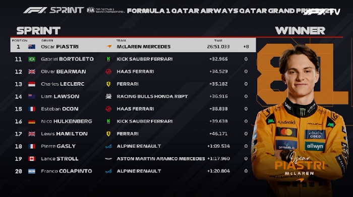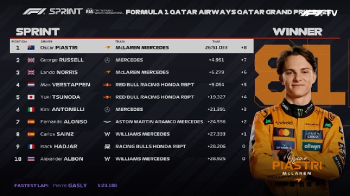 A sprint do GP do Catar terminou com Oscar Piastri de volta às vitórias, aproximando-se da liderança do campeonato. O australiano segurou a ponta na primeira curva, com George Russell em segundo e Lando Norris defendendo-se de Yuki Tsunoda, que posteriormente deixou o companheiro Max Verstappen passar. Kimi Antonelli ficou em sexto.
