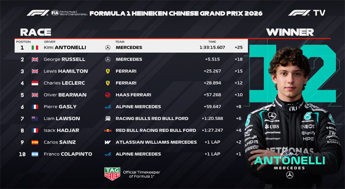 comentar formula 1, corrida F1 China, corrida Fórmula 1 hoje, f1, ferrari f1, formula 1, George Russell F1, Kimi Antonelli GP da China, lewis hamilton ferrari, mercedes f1, noticias f1, resultado GP da China, vitória Antonelli F1