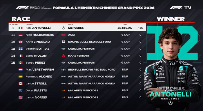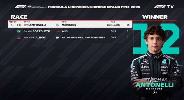 Kimi Antonelli conquistou a primeira vitória da carreira na Fórmula 1 no GP da China. O italiano cruzou a linha de chegada com vantagem confortável sobre o companheiro de equipe George Russell.