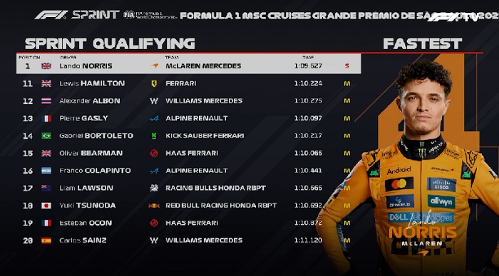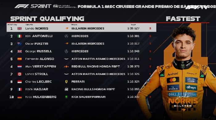 Lando Norris manteve sua perseguição ao primeiro título mundial com uma pole impressionante na sprint do GP de São Paulo. Além disso, o piloto de 25 anos superou Kimi Antonelli, da Mercedes. Enquanto isso, Oscar Piastri não conseguiu mais que P3, completando o top 3.