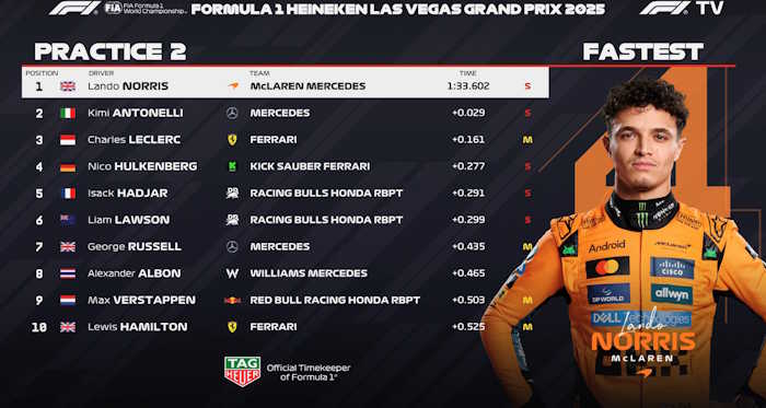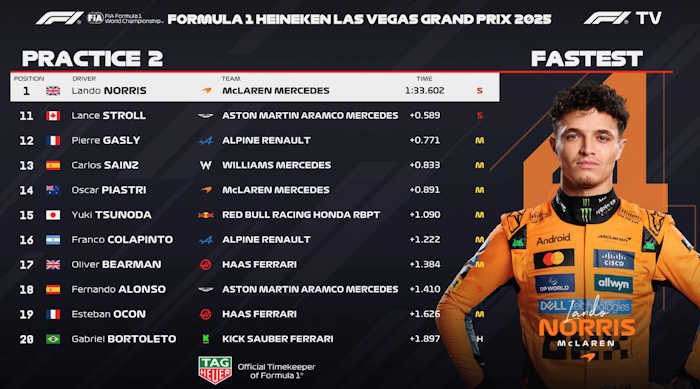 O líder do campeonato, Lando Norris, liderou o TL2 interrompido em Las Vegas devido a uma tampa de bueiro. Foi o mesmo problema que já havia acontecido em 2023 com Carlos Sainz