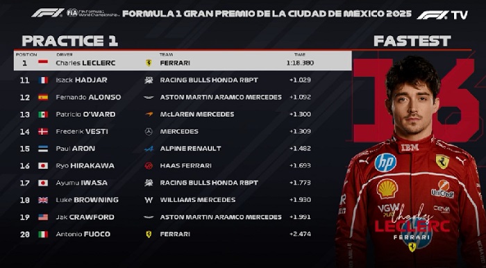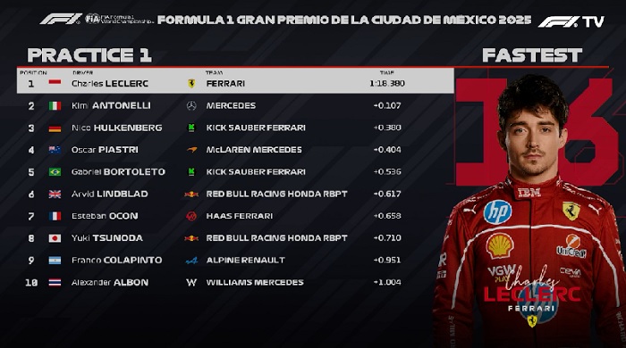 sexta-feira, 24 de outubro de 2025 às 16:35Leclerc mostra força e lidera o primeiro treino livre no México