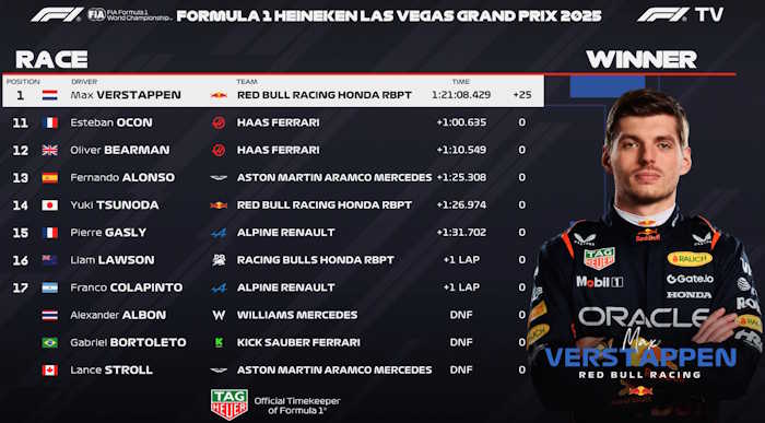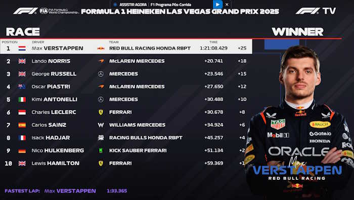 Com a vitória na noite de sábado, Max Verstappen continua a luta para retornar à disputa pelo título de 2025. O neerlandês assegurou o domínio no Circuito de Rua de Las Vegas pela segunda vez em três anos, aproveitando parte da icônica Strip. Venceu a corrida inaugural em 2023 e confirmou seu quarto título consecutivo aqui na temporada passada. Agora ele tem mais um triunfo em um evento que aborreceu o piloto antes da estreia, devido ao foco excessivo em celebridades e eventos sociais em detrimento da competição. Contudo, na hora de entrar no cockpit, o que Verstappen pensa sobre o evento é irrelevante, pois sua performance na pista é que dita o ritmo. Verstappen largou em segundo, mas assumiu o controle tático da corrida logo na curva inicial. O atual líder do campeonato, Lando Norris, executou uma manobra equivocada na partida e acabou saindo do traçado com seu McLaren.