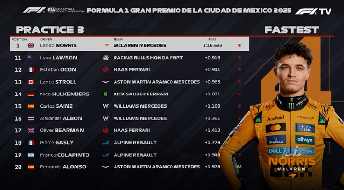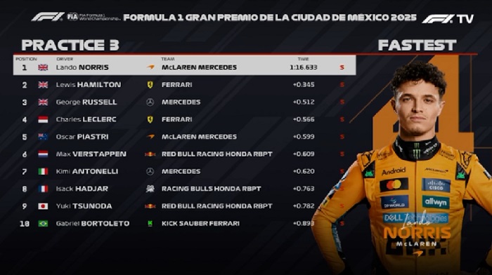 Lando Norris fechou o terceiro treino livre do GP do México no topo da tabela. O piloto da McLaren marcou 1:16.633s, superando Lewis Hamilton e George Russell com autoridade. Assim, a equipe britânica confirmou um ritmo competitivo antes da classificação.