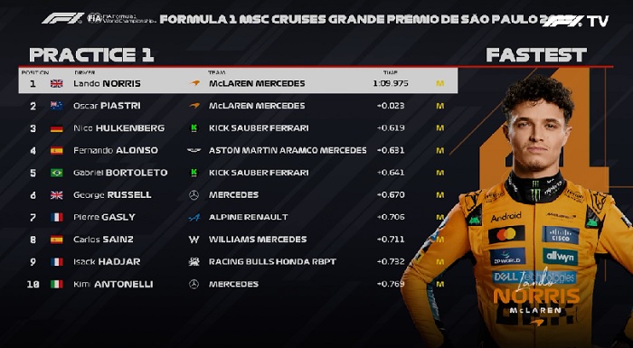 Entre os destaques, Gabriel Bortoleto impressionou em casa. No seu primeiro treino oficial em Interlagos, o brasileiro colocou a Sauber no top 5, logo atrás de Fernando Alonso, que terminou em quarto.