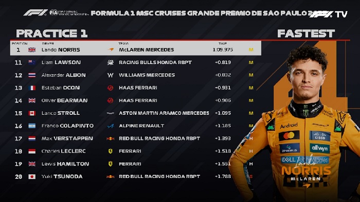 sexta-feira, 7 de novembro de 2025 às 12:50Norris domina o treino único em Interlagos