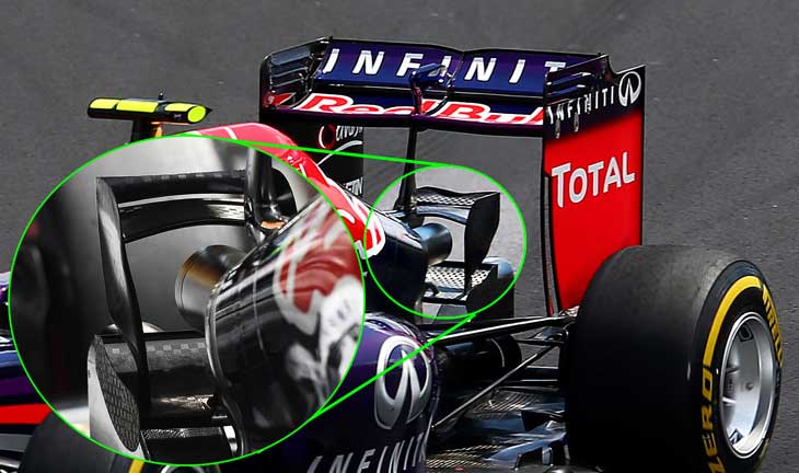 Também foi usada a asa traseira com ranhura vertical na ponta da placa lateral, com dois ângulos diferentes de incidência para cada piloto, Vettel com mais asa e Ricciardo com menos. Observe a borda do elemento principal