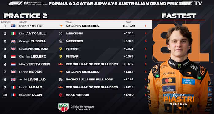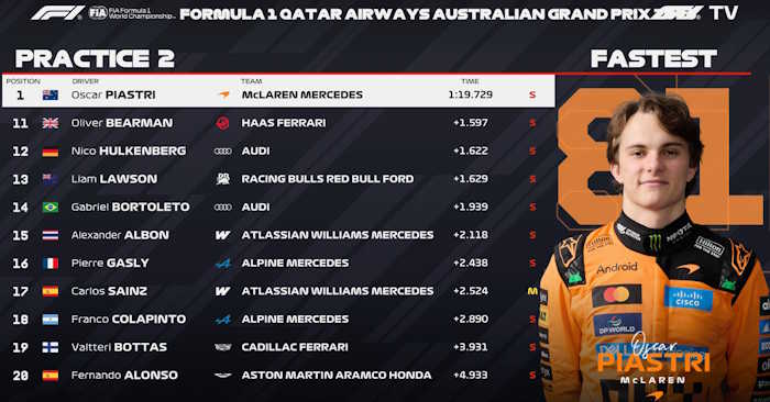 O piloto da casa, Oscar Piastri, foi o mais rápido no TL2 em Melbourne. Piastri encantou seus fãs ao liderar o segundo treino livre para o GP da Austrália na sexta-feira. Ele obteve dois décimos de segundo de vantagem sobre Kimi Antonelli.