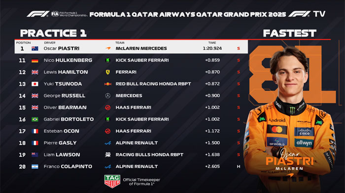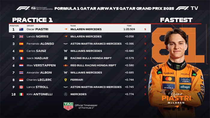 Oscar Piastri começou o GP do Catar de forma impecável e ditou o ritmo do único treino livre. O australiano registrou 1m20.924s e superou Lando Norris por 0.058s.