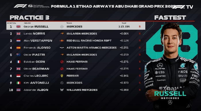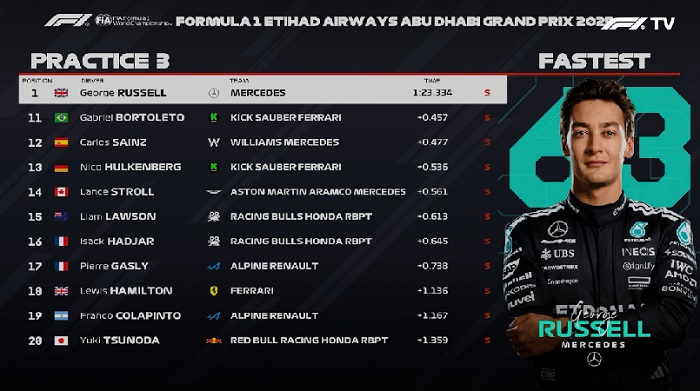 Yuki Tsunoda viveu um período ainda mais caótico. Ele se envolveu em um toque nos boxes com Andrea Kimi Antonelli e ainda virou alvo de outra investigação por bloquear Lando Norris. Mesmo com tantos eventos, o cronômetro continuou apertado. No fim, Norris ficou apenas quatro milésimos atrás de Russell.