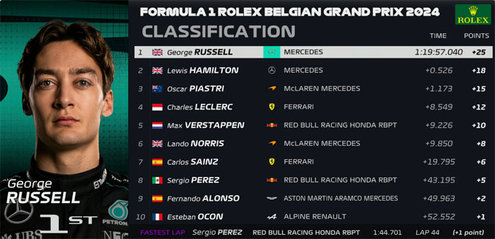 Entretanto, Russell se manteve firme diante do ataque de Hamilton e conquistou sua primeira vitória em Spa.