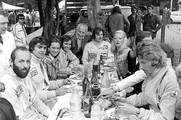 Aqui em Pau, durante um fim de semana de corrida de Fórmula 2 nos anos setenta, Henri Pescarolo, François Cevert, Emerson e Wilson Fittipaldi e Jean-Pierre Jabouille saboreiam o almoço.