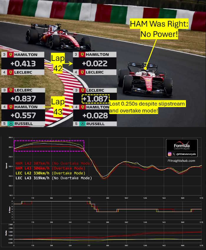 Leclerc atingiu 317 km/h sem vácuo ou modo de ultrapassagem, Hamilton apenas 307 (volta 42).