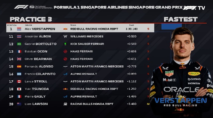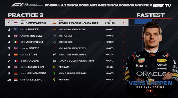 Max Verstappen cravou o tempo mais rápido no Treino Livre 3 (TL3) do Grande Prêmio de Singapura, confirmando seu ritmo de ponta. Ele superou o forte desempenho da McLaren, com Oscar Piastri em P2 e George Russell em P3, apenas atrás do tetracampeão. Andrea Kimi Antonelli e Lando Norris completaram o top 5, mostrando um grid competitivo.