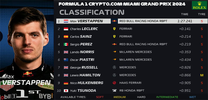 Perez se classificou em quarto à frente de Norris, que subiu para quinto com um jogo de pneus macios. Oscar Piastri, George Russell, Lewis Hamilton, Nico Hulkenberg e Yuki Tsunoda completaram os 10 primeiros.